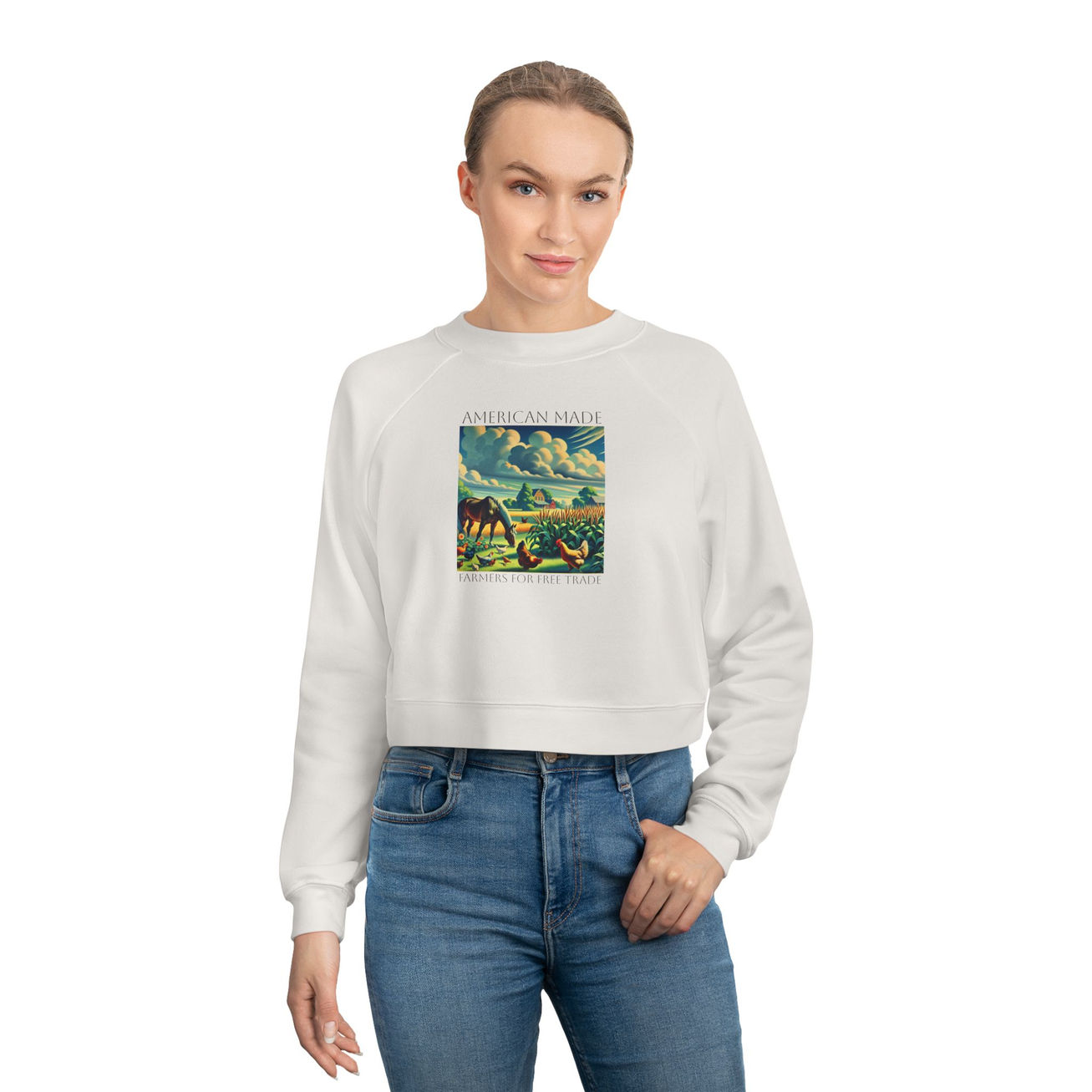 Introducing our cozy and stylish Cropped Fleece Pullover. Support American Farmers with this cool, retro art pullover while adding a touch of comfort and fashion to your everyday wardrobe. Its relaxed fit and mid-length design make it ideal for layering during chilly days or for a laid-back weekend vibe.